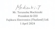 This Policy shall be published & communicated to all Employees level, Interested Parties and also above activities shall be acknowledged, practiced and achieved for enhancement of Environmental Management System Performance of Fujikura Electronics (Thailand) Ltd.